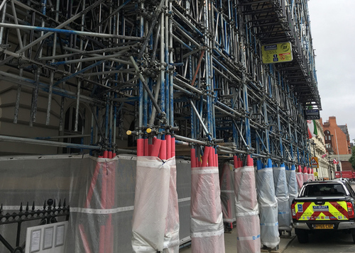 The installation of the scaffold, temporary roof and site accommodation is near completion. Due to the nature of the refurbishment works and ground conditions this has proved to be one of the most challenging and rewarding contracts we have undertaken. The design process has been intense and has varied considerably during the erection process to suit the ever changing site conditions. The end result is one of the most complex scaffold structures to be built in London.